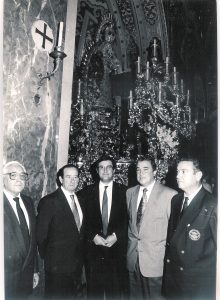 Procesión del Nuestra Señora del Santo Rosario del año 1981. En la foto, de izquierda a derecha, José Alvero Francés, Pedro Morales Muñoz, Joaquín Sáinz de la Maza y Conesa, Abel Moreno Gómez y José Antonio Santos Herrera.