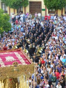 16- MADRE DE LA OLIVA Tras la visita obligada a las Hermanas de la Cruz, la Virgen de la Esperanza retomaba su camino hacia la basílica ésta vez a los sones de «Nuestra Señora de la Oliva», marcha dedicada a la Virgen de la Oliva y que El Carmen se permitió el lujo de tocarle a la Macarena… casi «ná»… momento increíble lleno de recogimiento y elegancia en la música y en el movimiento del Palio… con un Hermano Mayor emocionado y muchos vecinos del pueblo en una nube al recordar a su Virgen de la Oliva en el rostro de la Virgen de la Esperanza. A todo ello, José Antonio Santos, nuestro director retorno años atrás pidiendo interpretar ésta marcha como un músico más con su saxo tenor.