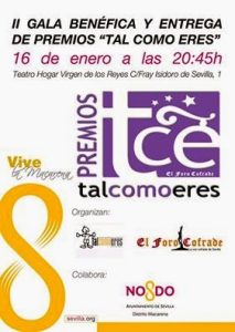 Dicha entrega se enmarcará dentro de la II Gala de entrega de Premios «Tal como Eres» que se celebrará en el Teatro Hogar Virgen de los Reyes a partir de las 20:45 h. y en la que además se hará entrega de los galardones a la mejor cuadrilla de costaleros 2014, mejor estreno musical, mejor estreno artístico, mejor momento cofrade de 2014 y a la mejor labor cofrade.