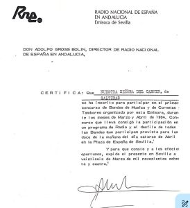 1984 _ Primer Premio I Certamen de Bandas Radio Nacional Española 1984 Director: José Antonio Santos Herrera I Certamen de Bandas de Música con Tambores y Cornetas que organizaba Radio Nacional de España en colaboración con la Diputación Inscripción en el Certamen. Anterior Siguiente